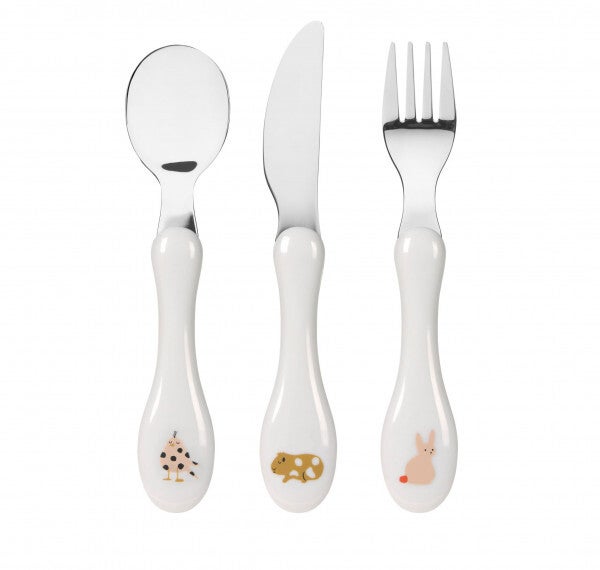 De mes-, vork- en lepelset is BPA-vrij en gemaakt van roestvrij, onvervormbaar staal met kunststof handgrepen.