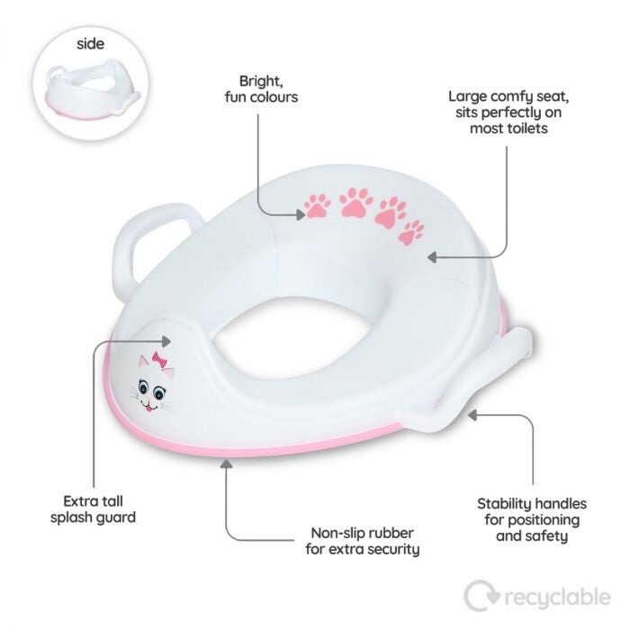 Sommige kinderen willen direct op het grote toilet, de meeste kinderen gaan eerst op het plaspotje en dan door naar het grote toilet. My Carry Potty heeft een collectie gemaakt met dezelfde 6 karakters als bij het plaspotje. My trainer seat is een brilverkleiner die past op de wc bril van een groot toilet. Door de antislip onderkant ligt deze goed stevig en gaat deze niet schuiven. De grote handvaten aan de zijkant zorgen ervoor een kind zich goed vast kan houden.