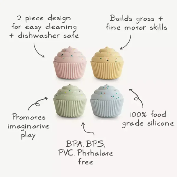 Voeg een vleugje zoetheid toe aan het speelplezier met onze mix-en-match siliconen cupcakes. Gemaakt in vier heerlijke tinten, kunnen kleintjes oefenen met het matchen van kleuren of creatief worden en hun eigen combinaties bedenken. De bestrooide glazuurlaag en de uitknijpbare siliconenbasis kunnen gemakkelijk worden gescheiden en opnieuw worden bevestigd om de fijne motoriek en hand-oogcoördinatie te helpen ontwikkelen. Met kleine afvoergaten aan de onderkant voor eenvoudige reiniging, zijn deze cupcakes een charmante toevoeging aan de speelkeuken, theetijd of badtijd.