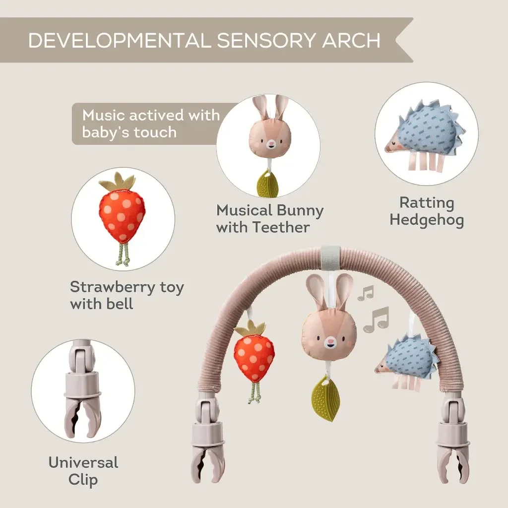 De muzikale konijnenboog is de perfecte metgezel voor avonturen onderweg. Hij is ontworpen om gemakkelijk vast te klikken aan de kinderwagen of autostoel dankzij de universele clips. Met drie leuke speeltjes: een aardbei met belletje, een rammelende egel en een muziekdoosje in het hoofd van het konijntje met kleurrijk trekblaadje. Baby wordt aangemoedigd om te schoppen en te trekken en zo de muziek te activeren. Dit stimuleert de motoriek en je kleintje leert over oorzaak en gevolg. De stoffen aardbei en de egel stimuleren de tastzin.