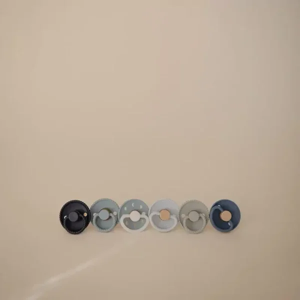 De FRIGG 6-Pack is een zorgvuldig samengestelde collectie van zes ronde fopspenen, waarin enkele van onze populairste designs en handgeselecteerde kleurcombinaties samenkomen in één elegante bundel.