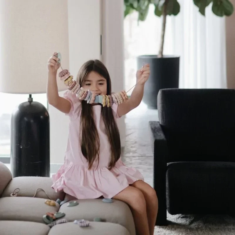 Ontdek de Mushie lacing bead set, een tijdloze klassieker die creativiteit én fijne motoriek stimuleert.