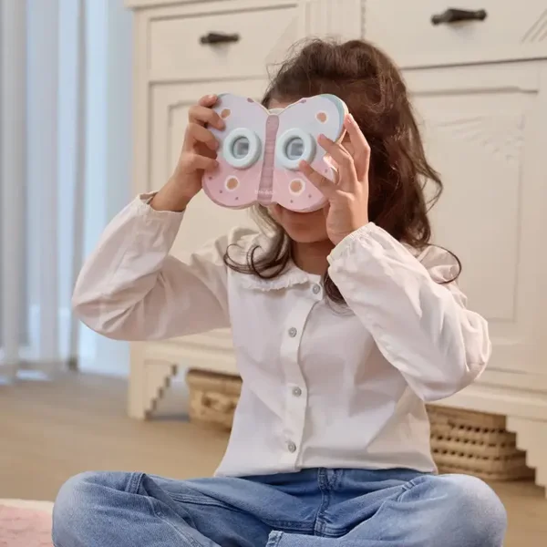 Stap samen in een magische wereld met deze houten verhalenkijker in de vorm van een vlinder. Draai aan de schijfjes en ontdek drie betoverende verhalen vol verwondering. De zachte kleuren en het lieve ontwerp maken elk kijkmoment bijzonder. Perfect om samen te genieten en de fantasie te prikkelen.