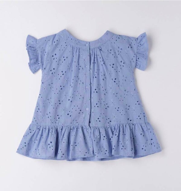 SARABANDA blauw kleedje met broderie afwerking